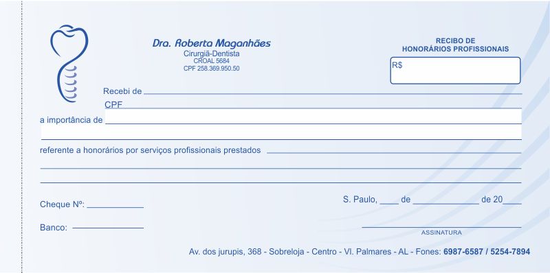 Nossos modelos de Recibos Carbonados para Odontologia são confeccionados com impressão 1x0 (1 cor à sua escolha e subtonalidades dessa mesma cor), no formato 20x10cm.